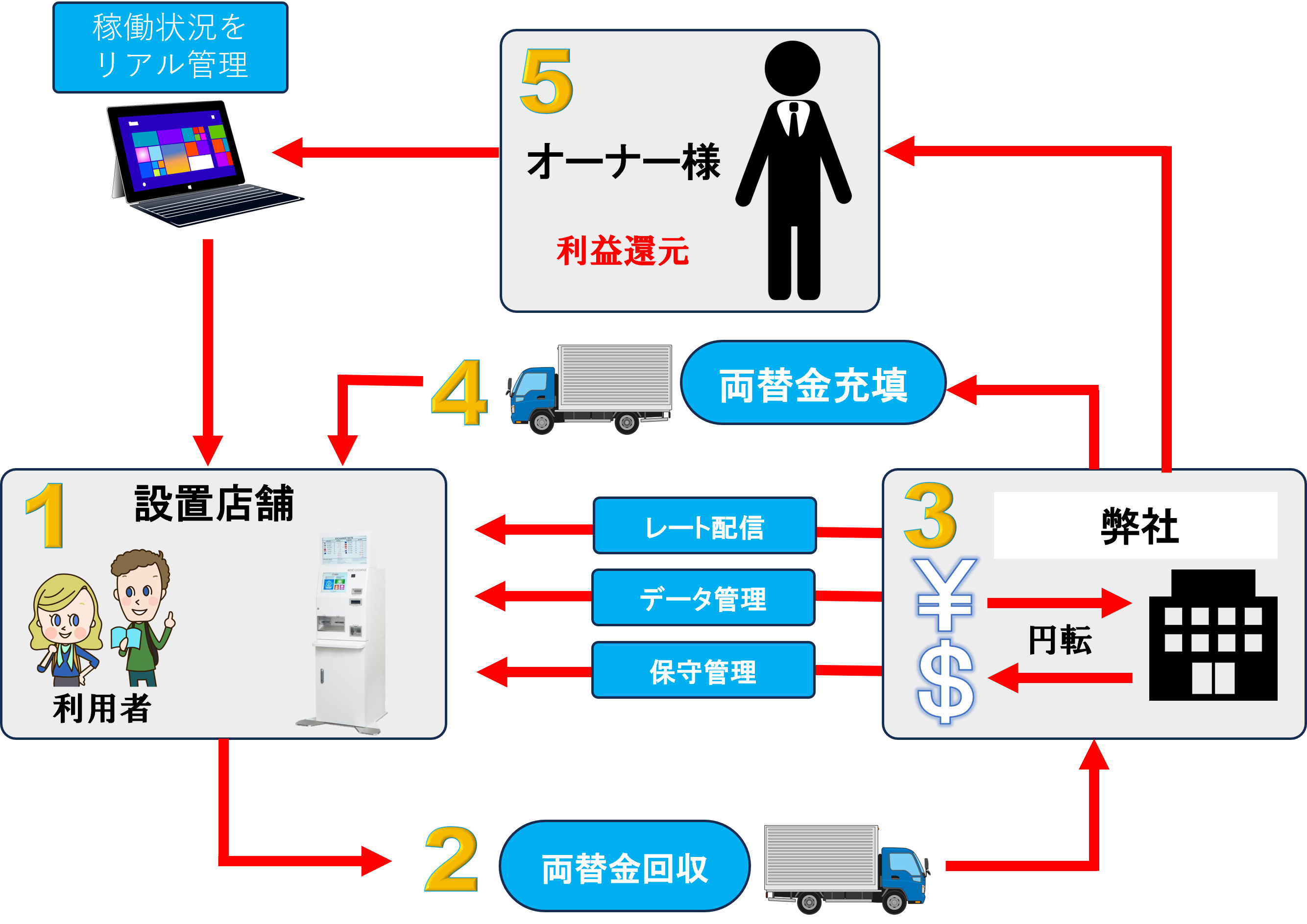 円転し日本円に両替した中から、機械に補填致します。カセットによる装填を行わないため、余分な準備金も不要となり、大幅なコストダウンが可能となります。